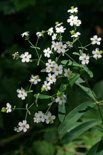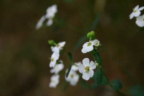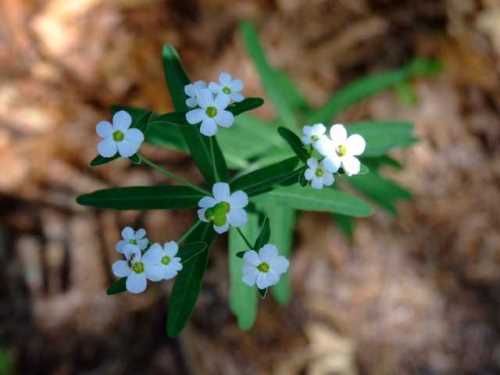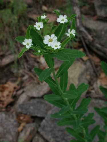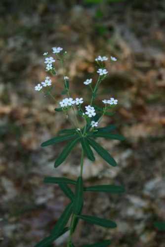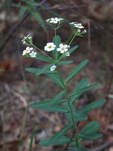 Euphorbia corollata; flowering spurge  [Euphorbiaceae]  Erect perennial with milky juice and significant plant-to-plant variation in height.  A single whorl of leaves separates the branched upper stem from the unbranched, alternate-leafed lower stem.  Structure of the small (¼") flowers is complex, but small white bracts produce the appearance of a simple, 4-5 petaled flower.  Fruits are three-lobed and stalked.  Old fields and dry woods.  Flowers throughout summer and early fall.  [056]