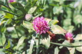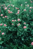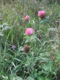 red clover (Trifolium pratense; BEAN FAMILY [Fabaceae]) Short-lived perennial with more or less ascending, branching stems. Flowers magenta or purple in typical stalkless globular clover heads. Leaves compound with 3 blunt, oval, leaflets usually marked with a white V. Common in fields and meadows and flowering from spring to fall. Another invasive European native. [080]