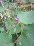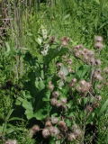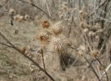 common burdock (Arctium minus; COMPOSITE FAMILY [Asteraceae]) Coarse biennial herb to 5’ tall. Large, alternate leaves, mostly with hollow petioles. Flower heads pink to purplish, ¾-1” wide; covered with bracts bearing inward-curving hooks. Fruits mature into round bristled burrs which stick tenaciously to fur and clothing. Roadsides, disturbed sites. Ecologically invasive Eurasian native. [105]