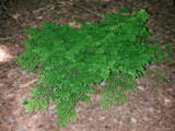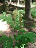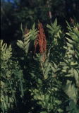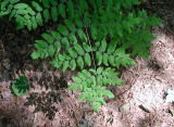royal fern (Osmunda regalis; ROYAL FERN FAMILY [Osmundaceae]) Fronds more than 3' tall, bipinnate, with large, narrowly attached oblong pinnules, widely spaced, and rather un-fern-like. Pinnae at the tip of fertile fronds are specialized for spore production and wither to brown in early summer. Found in wet forests and bogs. [009]