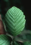 alder (Alnus spp.; BIRCH FAMILY [Betulaceae]) Trees or shrubs with broad deciduous leaves.  Buds are notable for being stalked.  Staminate flowers in long (4-6") catkins, pistillate in a cluster with woody bracts that persist like miniature conifer cones long after the fruits have been shed.  Of the 3 Wisconsin species, speckled (tag) alder is probably the most familiar.  It is a coarse, weak-wooded shrub that forms dense thickets along northern Wisconsin streams.  The largest divisions of its doubly-toothed leaves are large enough to be considered lobes.  [027]